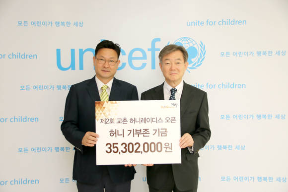 교촌에프앤비㈜가 유니세프한국위원회에 네팔지진 긴급구호를 위한 후원금 3천500여만원을 전달했다고 29일 밝혔다.교촌은 지난 8일부터 10일까지 경산 인터불고CC에서 진행된 '제2회 교촌 허니 레이디스 오픈' 골프대회에서 진행된 '허니 기부존' 이벤트 모금액을 비롯해 교촌치킨 지사협의회 및 현장 모금 등을 모아 후원금 3천500여만원을 조성해 유니세프 한국위원회에 전달하며 네팔 지진피해자 돕기에 힘을 보탰다.특히 대회 기간 18번 홀에 설치된 '허니 기부존'은 선수들의 티샷이 기부존 안에 안착하면 50만원씩 사회공헌 기금으로 적립되는 이벤트로 이번 대회에서는 총 62번 티샷이 안착, 총 3천100만원의 기금이 조성됐다.교촌은 작년 '제1회 교촌 허니 레이디스 오픈' 골프대회에도 '허니 기부존'을 진행했으며, 당시 조성된 기금은 독도사랑운동본부 및 민족운동단체 흥사단 등에 기부한 바 있다.교촌 관계자는 "골프대회를 통해 모금된 이번 기부금이 삶의 터전을 잃고 실의에 빠진 네팔 국민들에게 조금이나마 도움이 되길 바란다"며 "앞으로도 교촌 허니 레이디스 오픈을 나눔이 있는 골프대회로 이어가겠다"고 전했다.