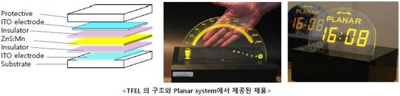 이밖에도 투명TFEL(Thin-Film Electro-Luminescence) 방식도 존재한다. 무기 형광체 내에 전자가 빠르게 지나가며 빛을 내는 원리다. 투명전극과 무기 형광체 사이에 절연막으로 구성된 간단한 구조(사진)를 택하고 있다.