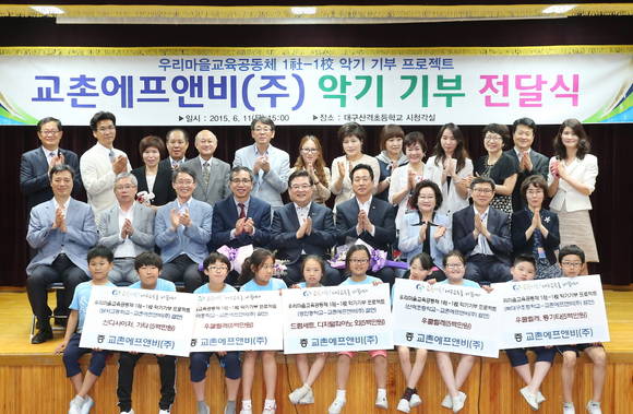 교촌에프앤비㈜가 대구 지역 5개 학교에 2500만원 상당의 악기를 지원, 기부 증서 전달식을 진행했다고 12일 밝혔다.교촌은 지난 11일 대구 산격초등학교 시청각실에서 대구지역 산격초교, 북대구초교, 산격중, 경진중, 달서고 등 총 5개 학교에 피아노, 드럼, 기타, 우쿨렐레 등 2500만원 상당의 악기를 지원한다는 내용의 기부 증서를 전달했다.이번 기부는 대구교육청이 추진하고 있는 '우리마을교육공동체 1社-1校 악기기부 프로젝트' 사업의 일환으로, 대구 지역 내 학교에 악기를 기부해 지역사회 발전 및 문화예술 분야의 인재 양성을 목적으로 하고 있다.교촌 관계자는 "악기연주는 학생들의 정서 순화와 인성 교육 등 성장에 큰 도움을 준다고 판단해 이번 기부를 결정하게 됐다"며 "대구 지역 학생들이 악기를 배우고 다루면서 음악을 통해 인생을 풍요롭게 살아갈 수 있길 바란다"고 말했다.