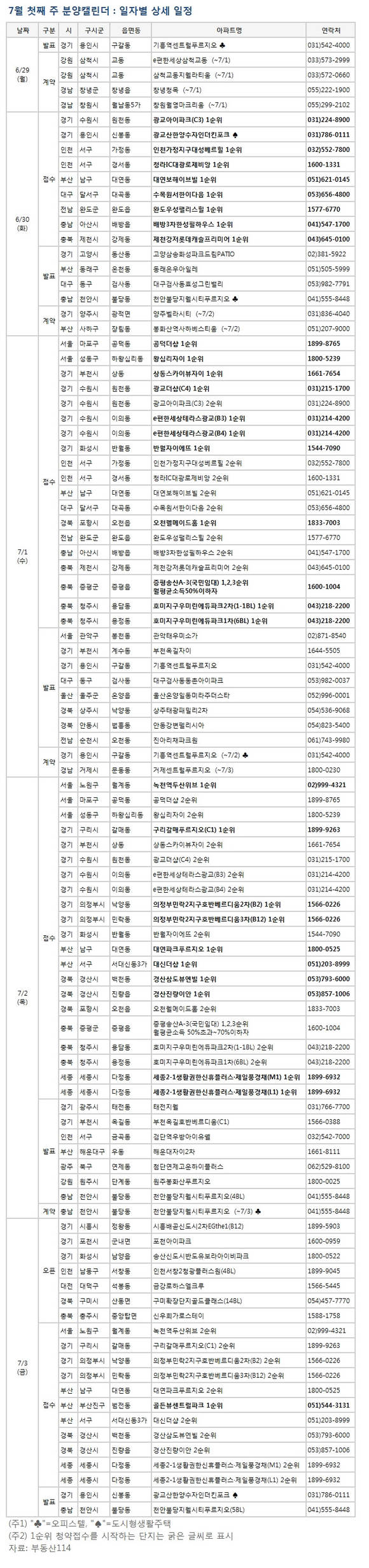 28일 부동산114에 따르면 7월 첫째주에는 전국 31개 사업지에서 2만495가구를 공급한다. 이중 민간분양은 29개 사업지, 총 1만9387가구다.