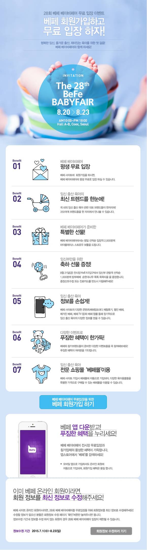오는 7월 1일부터 8월 23일까지 열리는 '베페 베이비페어' 무료 입장 이벤트가 시작된다.30일 베페는 이 기간 동안 베페 홈페이지와 모바일앱(구글 플레이스토어, 애플 앱스토어)을 통해 가입한 신규 회원 누구나 제28회 베페 베이비페어에 무료로 입장할 수 있는 이벤트를 진행한다고 밝혔다.기존 회원의 경우, 회원 정보 수정 후 전시회 무료 입장이 가능하다. 수정할 정보가 없는 회원이라면 회원정보 수정 페이지에서 '확인' 버튼만 누르면 된다.베페 온라인 회원가입 시 누릴 수 있는 혜택도 다양하다. 베페 베이비페어 평생 무료입장 혜택은 기본, 전시회 관람 시 350여 개 국내외 임신∙출산∙육아 관련 대표 브랜드를 한자리에서 만나볼 수 있다.특히 전시회 기간 중 20, 21일 양일간 선착순 입장객 2000명에게 마더플레이스 스트로우 보틀을 증정하며, 21일에는 전시장 Hall A3 입구에서 선착순 임신부 관람객 1000명(산모수첩이나 진료카드 지참)에게 밤부베베 순한 대나무 톡톡 목욕타올을 선물로 제공한다. 이외에도 베페와 참가 브랜드들이 준비한 이벤트 참여 시 푸짐한 선물도 받을 수 있다.베페 이근표 대표는 "많은 임신부와 아기 엄마, 아빠들이 베페 베이비페어에 참가, 임신∙출산∙육아에 관한 다양한 콘텐츠를 마음껏 즐겨보길 바라는 마음으로 이번 무료 입장 이벤트를 기획했다"며 "앞으로도 베페는 임신∙출산∙육아 기업 및 제품을 직접 경험하고 구매까지 할 수 있는 '오프라인 전시회' 운영과 소통을 기반으로 관련 정보를 공유하는 '온라인(모바일) 서비스 확대' 등 전 방위 채널 운영을 바탕으로 국내 육아문화 선도를 위한 다양한 노력을 전개할 예정"이라고 전했다.