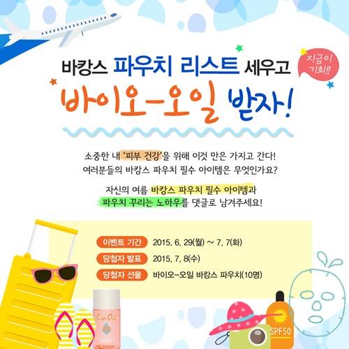 본격적인 여름 시즌을 앞두고 뷰티업계에서는 관련 마케팅 준비가 한창이다.피부 손상 개선에 효과적인 바이오-오일은 본격적인 바캉스 시즌을 맞아 피부 건강을 지켜줄 '나만의 똑똑한 바캉스 뷰티 파우치 꾸리기' 블로그 이벤트를 7월 7일(화)까지 진행한다.이번 이벤트는 바이오-오일 공식 블로그(http://blog.naver.com/bio_oil)에 방문해 강렬한 햇빛과 자외선 등으로 손상 받은 피부를 위해 꼭 필요한 뷰티 아이템과 자신만의 파우치 꾸리는 노하우를 함께 댓글로 남기면 자동 응모 된다.응모자 중 추첨을 통해 선정된 10명에게는 휴양지에서 손상된 피부 개선에 도움을 주는 바이오-오일과 거즈팩, 미스트 공병 등이 담긴 바이오-오일 뷰티 바캉스 파우치를 선물로 증정한다. 당첨자 발표는 7월 8일(수) 바이오-오일 블로그에서 확인할 수 있다.바이오-오일 관계자는 "바이오-오일은 여름철 강한 자외선 등으로 손상된 피부 개선은 물론 매끈한 바디 연출에 도움을 주는 등 머리부터 발끝까지 사용 가능한 멀티 오일로 바캉스 필수 아이템임을 알리고자 이번 이벤트를 기획하게 됐다"고 말했다.유한양행의 바이오-오일은 보습은 물론 노화 피부 등 피부 손상 개선과 예방에 탁월한 효과를 발휘해 전세계적으로 사랑 받는 멀티 오일이다. 가볍고 산뜻한 텍스처로 무더운 여름에도 부담 없이 사용할 수 있다.한편 바이오-오일은 올리브영 등 드럭스토어와 전국 주요 약국에서 구입할 수 있다.