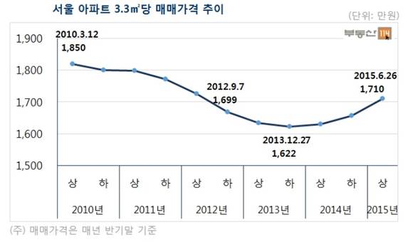 2일 부동산114에 따르면 서울 아파트 매매가격은 2012년 9월 1699만원으로 떨어진 이후 이달 들어 1710만원으로 회복했다.