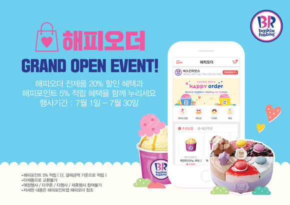배스킨라빈스가 '해피오더' 픽업 서비스를 3일 론칭했다.이번에 새롭게 선보인 배스킨라빈스의 '해피오더' 픽업 서비스는 언제 어디서나 해피포인트 앱을 통해 사전에 주문과 결제를 진행하고, 예약한 시간에 매장에서 제품을 바로 찾아가는 서비스다.'해피오더' 서비스 참여 방법은 해피포인트 앱 내 '해피오더' 메뉴를 클릭하고, 주문할 제품과 픽업할 매장을 선택한 후 주문 내용과 유의사항 확인 후에 결제를 진행하면 된다. 결제 후에는 예약한 시간에 맞춰 지정매장을 방문하면 주문번호 제시 후에 바로 제품 픽업이 가능하다.배스킨라빈스는 오는 30일까지 해피오더로 주문할 경우 배스킨라빈스의 전 제품 20% 할인 혜택을 제공한다. 또한 할인 혜택과 동시에 해피포인트 5% 적립이 가능하다.단 매장행사, 타쿠폰, 타행사 중복참여 및 타 제품으로의 교환은 불가능하다. 자세한 내용은 해피포인트 앱 내 '해피오더' 메뉴에서 확인할 수 있다.배스킨라빈스 관계자는 "소비자들이 스마트 기기를 사용해 피크시간대 대기시간을 감소시켜 배스킨라빈스를 더욱 편리하게 즐길 수 있기를 바라는 마음에서 '해피오더' 서비스를 론칭하게 되었다"며 "무더위가 계속되는 요즘, 배스킨라빈스 '해피오더' 서비스로 원하는 매장과 시간대를 지정해 특별한 혜택을 즐기길 바란다"고 전했다.