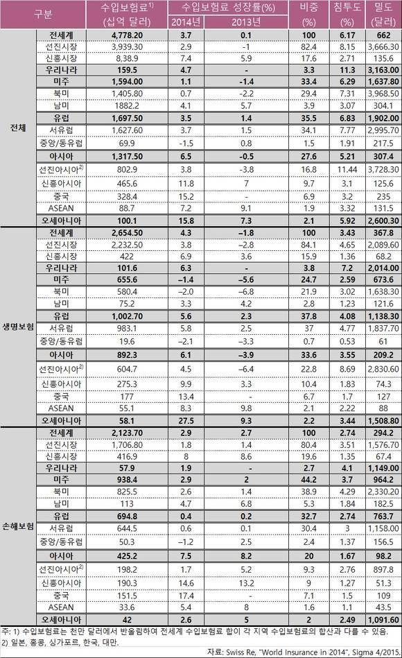 우리나라의 지난해 보험산업 수입보험료는 2013년 대비 4.7% 증가한 1595억 달러(세계 8위)였고, 총보험료에 인구수를 나눈 보험밀도는 3163억 달러(세계 19위), 총보험료에 명목 실질국내총생산(GDP)를 나눈 보험침투도는 11.3%로 세계 4위였다.