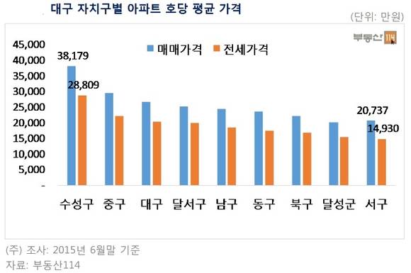 치솟은 매매가격만큼 전셋값도 크게 올랐다. 수성구 아파트 전셋값(2억8809만원)은 서구(1억4930만원)에 비해 2배 가까이 높다.
