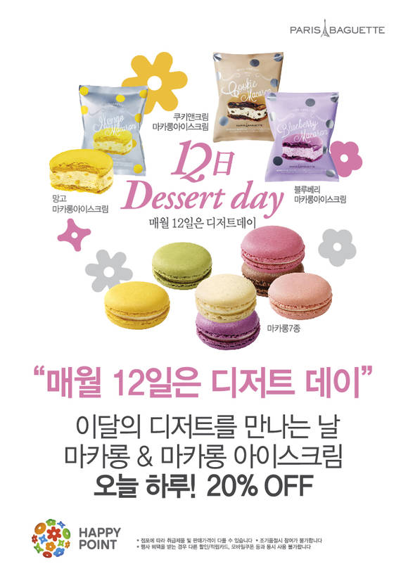 이에 12일 '디저트 데이'에 해피포인트를 이용하는 전 고객은 파리바게뜨에서 마카롱과 마카롱 아이스크림 구매 시 20% 현장 혜택을 받을 수 있다.