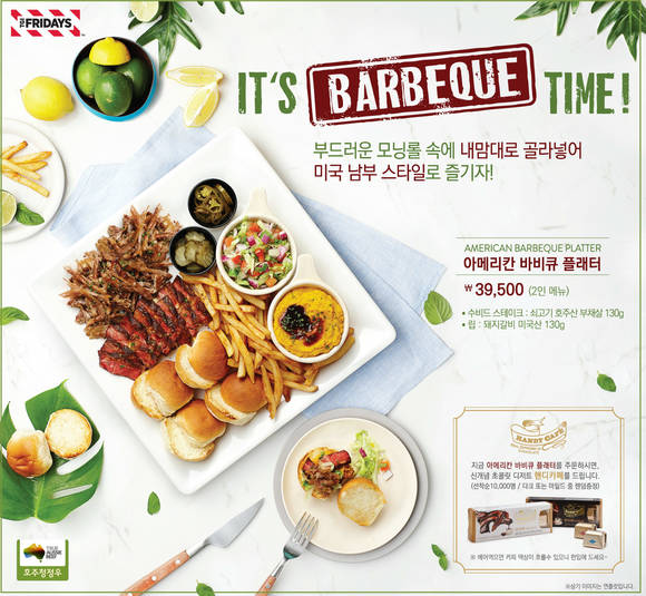 TGI프라이데이스가 오는 17일부터 취향대로 만들어 먹는 메뉴 '아메리칸 바비큐 플래터'를 3만9500원에 판매한다.새롭게 선보이는 '아메리칸 바비큐 플래터'는 다양한 재료들을 한 접시에 담아 고객이 직접 구성해 먹는 미국 남부 스타일의 DIY 제품 컨셉으로 감자튀김, 스테이크, 립 및 다양한 야채들을 모닝롤에 조합해 먹는 메뉴이다.'아메리칸 바비큐 플래터' 메뉴는 TGI프라이데이스의 대표 립 메뉴인 점보립(130g)과 패밀리레스토랑 최초로 진공 포장한 쇠고기를 저온의 물속에서 장시간 초벌 조리한 후 그릴에 굽는 방식인 수비드(Sous-vide) 스테이크(부채살,130g)와 감자튀김, 토마토 살사 등 다양한 재료들로 구성되어 있다.새롭게 선보이는 '아메리칸 바비큐 플래터' 메뉴는 9월 30일까지 전국 TGI프라이데이스 매장에서 판매 되며, 해당 메뉴 고객 선착순 10,000명에게는 신개념 초콜릿 디저트 핸디카페를 무료로 증정한다.또한 매주 일요일 TGI프라이데이스에서는 L.Point 10% 차감 통해 TGI프라이데이스 메뉴 50% 할인 이벤트를 함께 운영해 합리적인 가격으로 다양한 제품을 즐길 수 있는 할인 이벤트도 함께 운영한다.TGI프라이데이스 관계자는 "새롭게 선보이는 '아메리칸 바비큐 플래터; 메뉴는 다양한 재료들을 모닝롤에 고객이 직접 입맛에 맞춰 즐길 수 있는 DIY 메뉴로 먹는 방식에 재미를 더 했다"면서 "TGI프라이데이스의 립과 레스토랑 업계 최초 선보인 수비드 공법의 스테이크 메뉴를 함께 즐기며 TGI프라이데이스 방문 고객께서는 기분 좋은 경험과 합리적인 가격으로 메뉴를 즐겨 보기를 바란다"고 전했다.