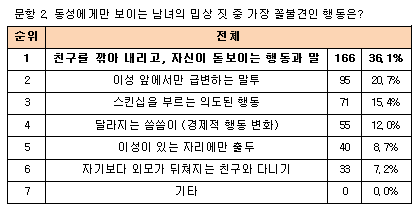 동성에게만 보이는 남녀의 밉상 짓 중 가장 꼴불견인 것으로 남성은 '친구를 깎아 내리는 말과 행동'(41.8%)을 꼽았다. 이어 '달라지는 씀씀이'(24.9%), '스킨십을 부르는 의도된 행동'(13.6%) 순이다. 여성은 '이성 앞에서만 급변하는 말투'(33.2%), '친구를 깎아 내리는 말과 행동'(31.2%), '스킨십을 부르는 의도된 행동'(17%)이라고 답했다.