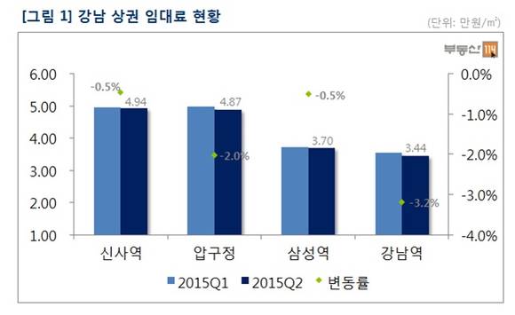 서울에서 유동인구가 많은 대표적 지역인 강남은 메르스로 인해 중국인 등 외국인 관광객이 줄어든데다 새로운 상권 확장 요인도 부족해 월 임대료가 하락했다.