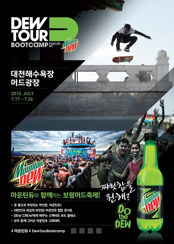 롯데칠성음료의 탄산음료 브랜드 마운틴듀가 24일부터 26일까지 대천해수욕장 보령머드축제가 열리는 머드광장에서 이벤트를 실시한다.이번 행사는 본격적인 여름 피서 시즌을 맞아 '짜릿함을 원해? Do the Dew!'라는 주제로 마운틴듀만의 도전적이고 짜릿한 브랜드 이미지를 직접 체험할 수 있도록 기획되었다.이벤트를 통해 마운틴듀는 스케이트보드 프로팀의 화려한 데모쇼와 초보자를 위한 스케이트보드 스쿨 프로그램을 제공한다. 또한, 온 몸으로 부딪히는 슬라이딩 게임 '마운틴듀 인간 볼링', 시원한 물 폭탄이 쏟아지는 '마운틴듀 워터밤' 등의 다양한 게임도 준비했다. 게임에 성공한 참가자들에게는 '마운틴듀 롱넥보틀'과 '듀 스냅백'등 다양한 선물이 현장에서 바로 증정된다.25일에는 가수 박재범 등이 참가하는 '마운틴듀 힙합 콘서트'가 보령머드축제 특설무대에서 열릴 예정이다.마운틴듀 마케팅 담당자는 "마운틴듀가 가진 도전적인 브랜드 이미지를 이벤트 현장에서 소비자들에게 직접 전달함과 동시에, 무더위를 잊게 하는 시원함과 짜릿함을 함께 선사하고자 이번 이벤트를 기획했다"라며 "앞으로도 글로벌 브랜드로서 다양한 마케팅 활동을 펼치며 마운틴듀의 브랜드 인지도를 높여갈 계획"이라고 말했다.