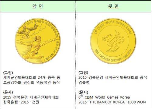 한국은행은 오는 10월 2일부터 11일까지 경북 문경시를 포함한 8개 시·군에서 열리는 '2015 경북 문경 세계군인체육대회'를 기념하는 기념주화 1종을 발행한다.