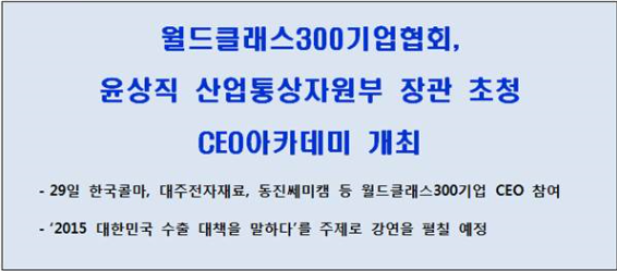 월드클래스300기업협회(회장 윤동한)는 오는 29일 회원사 CEO를 대상으로 '2015 대한민국 수출 대책을 말하다' CEO 아카데미를 개최한다고 27일 밝혔다.