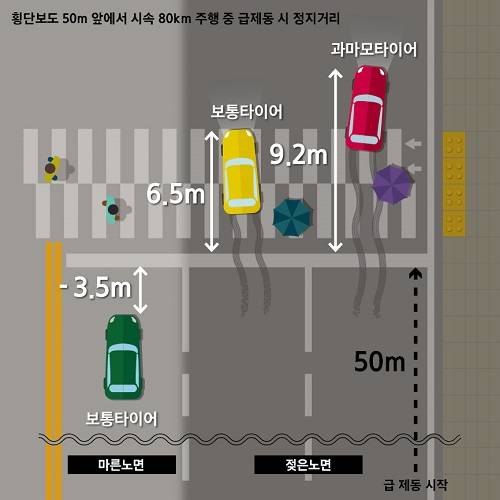 ◇ 빗길 양호한 타이어와 비교시 과마모 타이어 정지거리 6.1m이상 길어