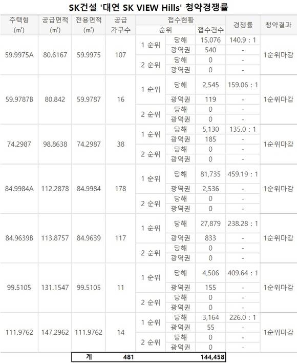30일 SK건설에 따르면 이 단지는 전용면적 59~111m² , 481가구 모집에 14만4458명이 청약을 접수했다. 특히 178가구를 공급하는 84m²A는 8만1735명이 몰려 459.19대1의 경쟁률을 보였다.