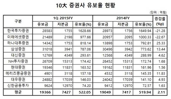 31일 국내 주요 증권사 10곳이 금융감독원에 제출한 최근 분기보고서에 따르면 국내 주요 증권사 10곳의 유보율은 작년 말 대비 2.11%p 늘었다. 회사별로 보면 미래에셋증권과 한국투자증권을 제외하곤 8개사 모두 유보율이 1.56~25.33%p의 증가율을 보였다.