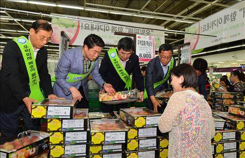 오는 7일부터 내달 초순까지 수도권 '하나로마트' 주요 매장에서 우박피해 농가에서 생산한 사과와 복숭아를 정상가보다 최대 50% 할인한 가격에 판매한다.
