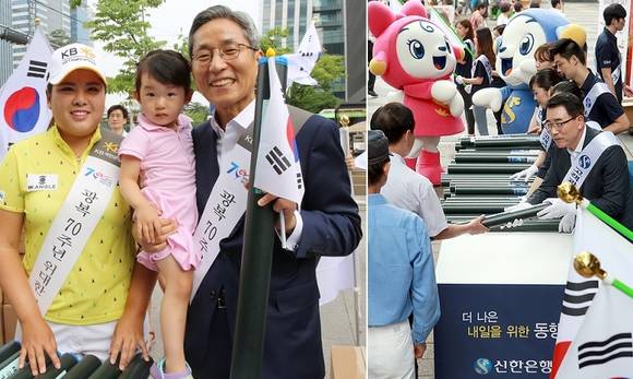 정부가 내수 활성화를 위해 오는 14일을 임시공휴일로 지정하면서 시중은행들도 각종 이벤트를 선보이고 있다. 광복 70주년 기념 특판 예·적금 상품을 내놓은 데 이어 광복절 연휴기간 동안 시민들이 참여할 수 있는 다양한 행사도 마련했다.KB국민은행은 서울, 부산, 인천, 대구, 대전, 광주, 울산 등에서 광복 70주년을 기념해 시민들에게 무상으로 태극기 7000장을 나눠주는 '태극기 사랑' 이벤트를 펼치고 있다.윤종규 KB국민은행장은 지난 11일 서울 여의도에서 직접 태극기를 나눠주고, '태극기 달기 범국민 운동'에 함께 할 것을 당부했다. 아울러 광복절 연휴가 끝나는 16일까지 KB국민은행 전 영업점에 태극기를 게양할 계획이다.같은 날 조용병 신한은행장도 서울 중구 명동에서 시민들에게 태극기 2000장을 직접 나눠주는 '나라사랑, 태극기사랑' 캠페인을 펼쳤다. 신한은행은 지난 2004년부터 각 가정에서 국경일을 기념하며 태극기를 계양할 수 있도록 삼성동 코엑스몰, 탑골공원 등에서 이같은 캠페인을 계속 진행해오고 있다.신한은행은 지난 3일에는 서울 지하철 1,2호선 환승역에 김구, 서재필, 등 독립운동가 70인을 기념하는 광고를 게재하기도 했다. 이 광고는 8월 한달 동안 진행할 예정이며, 광고 35개를 모두 찍어 소셜네트워크서비스(SNS)에 공유하는 고객 선착순 30명에게 문화상품권을 증정할 계획이다.아울러 오는 14일과 15일 이틀 동안 서울 청계천 광장과 명동에서 고객이 꾸미고 사진도 찍는 '무궁화 포토월(Photo Wall)' 행사를 진행할 예정이다. 광복절인 15일에는 용산구에 위치한 전쟁기념관에서 '무궁화 그리기' 행사도 열 계획이다.또한 대다수의 시중은행들이 14일 임시공휴일에 현금자동입출기(ATM) 등 금융거래 수수료를 평일과 동일하게 운영할 계획이다. 임시공휴일임에도 불구하고 자영업자 등 출근하는 사람들을 감안해 수수료 부담을 완화하기로 한 것.다만 NH농협은행과 농협 상호금융, 전북은행은 14일부터 16일까지 광복절 연휴기간 총 3일동안 현금자동입출기(ATM) 이용수수료를 면제해준다. 연휴기간 동안 자동화기기 운영시간에는 현금 입출금과 계좌이체 시 발생하는 모든 수수료를 면제할 예정이다.이와 함께 시중은행들이 광복 70주년을 맞아 내놓은 특판 예·적금 상품들도 꾸준히 인기를 끌고 있다.지난 3월 하나은행과 외환은행이 광복 70주년을 맞아 내놓은 '대한민국만세 예·적금' 을 내놓았는데 예금 상품에만 이달까지 총 1조 이상 몰린 것으로 전해진다.고객이 광복절까지 가입하면 은행은 계좌당 815원 출연금을 국내.외 독립유공자 지원 및 해외 독립유적지 보존에 사용하는 상품이다.적금 가입액은 1000만원 이상으로 각각 1년, 2년, 3년, 5년으로 설정할 수 있고 한도는 자유적립식 월 100만원, 정액적립식 500만원이다. 1년 만기 기준 최고 금리는 연 2.05%고 온라인 뱅킹에서 나라사랑 메시지 작성시 우대금리로 연 0.2%포인트를 더 받을 수 있다.우리은행도 지난 6월 말부터 광복절 당일까지 총한도 7000억원 범위에서 '8.15 70주년 정기예금'을 판매하고 있다. 기본금리는 8개월 정기예금의 경우 연 1.50%, 15개월이면 연 1.65%다. 독립유공자나 가족이 가입할 경우 기본금리에서 추가로 0.2%포인트 우대금리도 제공하고 있다.NH농협은행과 농협상호금융도 지난 6월 초 '광복 70년 815 예·적금' 특판 상품을 선보였다. 가입 계좌당 700원을 적립해 광복 70년 기념 사업을 위한 기금을 조성하고, 만기 해지금액이 1945만원 이상이면 연 0.1% 우대금리를 제공한다.