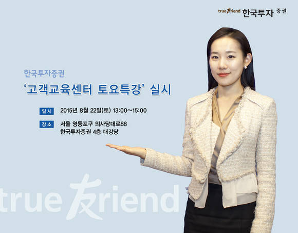 한국투자증권은 오는 22일 오후 1시부터 여의도 본사 4층 대강당에서 '고객교육센터 토요특강'을 진행한다고 19일 밝혔다.