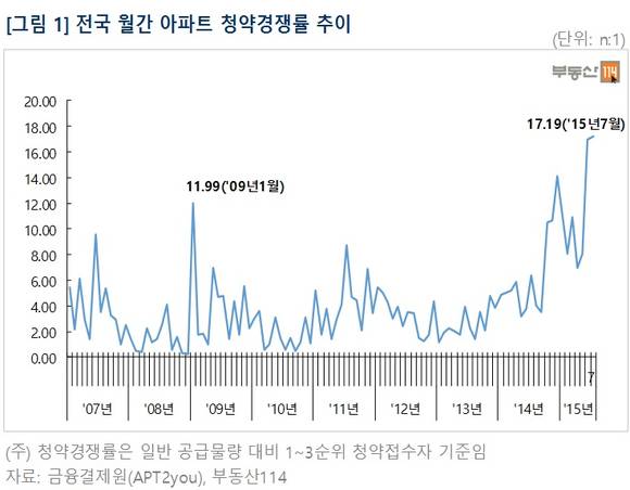 올해 7월(19일 기준) 전국 청약경쟁률이 글로벌 금융위기 이후 최고치인 17.19대1을 기록했다.