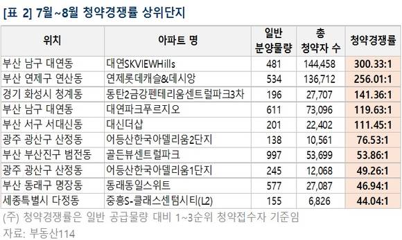 특히 7월 분양된 부산 남구 대연동 '대연 SK뷰 힐스'는 481가구 분양에 14만명 이상이 청약해 경쟁률이 300대1을 넘었다. 부산은 대연 SK뷰 힐스 외에도 7~8월 청약경쟁률 상위 10개 단지 중 6개가 있어 청약 경쟁률 상승을 주도했다.