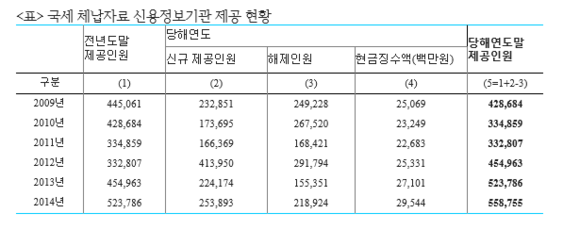 국세 체납으로 인해 신용정보기관에 체납 사실이 제공되어 신용등급 평가 불이익을 받다가 뒤늦게 밀린 국세를 납부한 징수액도 △2012년 253억원, △2013년 271억원, △2014년 295억원에 달했다.
