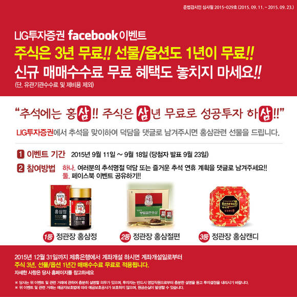 본 이벤트에 참여를 원하시면 9월 18일까지 LIG투자증권 페이스북(www.facebook.com/LIG.Orda)에 게시된 '추석 이벤트' 게시글에 추석맞이 덕담이나 추석 연휴 계획을 댓글로 남기고, 해당 게시글을 공유하면 된다. 이벤트 종료 후 추첨을 통해 '정관장' 홍삼 제품을 사은품으로 제공할 예정이다.