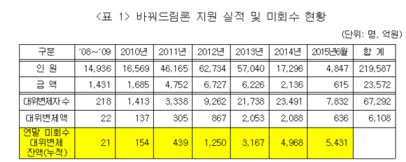 한국자산관리공사가 22일 새누리당 이운룡 의원에게 제출한 자료에 따르면 국민행복기금을 통해 고금리대출을 시중은행의 저금리대출로 바꿔주는 바꿔드림론의 경우, 2013년부터 미회수된 대위변제자 수가 큰 폭으로 증가하고 있다.