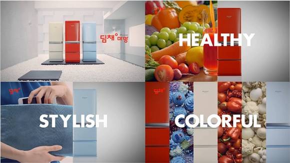동시에 다른 화면에는 딤채 마망에 보관할 수 있는 김치, 야채 등의 다양한 식자재와 딤채 마망을 사용하며 누릴 수 있는 스타일리시한 라이프스타일 등이 감각적으로 표현했다.
