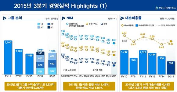 계속된 순이자마진 하락에도 불구하고 3분기 누적 이자이익은 4조 9637억원으로 전년 동기 대비 소폭(1.9%) 감소하는데 그쳤고, 분기별로는 2분기와 3분기에 그룹 이자이익이 각각 1.2%, 1.4% 증가하는 등 견조한 흐름세를 유지했다.