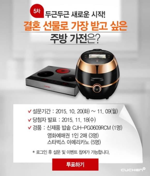 이번 설문 참여자에게는 추첨을 통해 가마솥 외형에 '명품철정 엣지' 내솥을 적용한 신제품 6인용 쿠첸 밥솥 'PG06'(1명)과 영화예매권(3명, 1인 2매), 스타벅스 아메리카노 쿠폰(5명) 등 다양한 경품이 증정된다.당첨자는 내달 18일 발표될 예정이다. 쿠첸은 이번 설문조사 결과를 향후 혼수 마케팅 전략에 활용할 계획이다.
