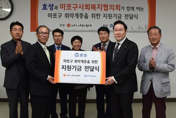 효성의 마포구 지역 주민들을 위한 이웃사랑 실천이 지속되고 있다.효성은 본사가 위치한 마포구 독거노인 등 차상위 계층을 위해 '사랑의 쌀' 20kg짜리 500포대를 전달했다고 28일 밝혔다.효성은 2006년부터 매년 마포구에 거주하는 어려운 이웃들을 위해 사랑의 쌀을 전달하고 있다.마포구청의 주민생활지원팀을 통해 차상위 계층 500세대를 선정 받아 일부는 임직원들이 직접 전달한다.쌀은 지역농촌을 돕기 위해 경남 함안군 군북농협에서 구입했다.조현상 효성나눔봉사단장(부사장)은 "이번 사랑의 쌀 전달을 통해 저소득 가정에 꼭 필요한 도움을 제공할 수 있어 기쁘다"며 "효성은 앞으로도 지속적으로 이웃들과 온정을 나누는 마포구의 일원이 될 수 있도록 노력하겠다"고 말했다.한편, 효성은 사랑의 쌀을 비롯해 사랑의 김장김치 전달, 마포구 희망나눔 페스티벌 후원, 취약계층 대상 긴급자금 지원 등 마포구의 이웃들과 함께 공생해 나가기 위해 지속적인 사회공헌활동을 펼치고 있다.