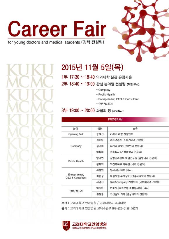 고려대 안암병원(원장 김영훈)은 내달 5일 의과대학생과 전공의를 대상으로 ‘Career Fair for young doctors and medical students: 경력컨설팅’을 실시한다.