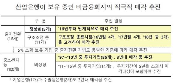 산업은행은 미래성장, 해외진출, 통일금융 등 3대 기능을 중심으로 확대하되, 시장과 마찰을 야기하는 상업적 목적의 IB기능은 축소한다. 즉, 해외채나 해외PF 중기 M&A 등 민간공급이 없는 영역에서의 산업은행 역할은 확대하되, 우량등급 회사채나 상업적 일반부동산 투자 등 민간의 역량이 강화된 부분에서는 IB기능을 줄여나갈 방침이다.산업은행의 체질 개선을 위해 보유 중인 비금융회사 매각도 적극 추진한다. 현재 산업은행은 구조조정 기업의 출자전환, 중소·벤처 투자 등 목적으로 비금융회사를 보유하고 있다. 출자 비율을 따져보면 5%이상 출자한 기업은 377개(장부가액 9조2000억원), 15% 이상 기업은 118개(2조 3000억원)에 달한다.문제는 그동안 일부 보유 기업 매각 처리가 지연되면서 투자기간이 길어지는 등 부작용이 발생됐다. 이에 따라 정책 목적이 달성된 기업은 적극 매각을 추진하고, 새로운 기업에 재투자한다. 앞으로 3년 동안 '신속매각·시장가치 매각' 원칙을 수립하고 관리체계를 개선할 계획이다.정상화된 출자전환 기업, 5년 이상 투자한 중소·벤처 기업을 대상으로 연도별 매각계획을 수립하고 실적을 주기적으로 점검한다. 집행과정에서 매각계획에 포함된 기업을 매각할 때는 임직원 면책을 통해 적극적 매각을 유도한다는 방침이다.이와 함께 산업은행 내 '자회사관리위원회'를 신설하고 보유 중인비금융 회사의 전문성과 독립성을 강화한다. 비금융회사의 취득-관리-매각 등 모든 과정을 관리하게 된다.금융위원회 관계자는 “이번 방안은 산업은행과 기업은행이 내년부터 업무 계획에 반영해 수립할 계획이며, 산업은행은 정책금융 역할 강화 방안에 따라 전면적인 조직·인력 개편으로 쇄신을 추진할 것”이라고 밝혔다.한편, 산업은행은 앞으로 중견기업에 대한 직접 지원도 확대하고, 중견후보 육성프로그램을 강화해 기업의 성장지체 방지에 힘쓴다. 지난해 연간 21조 6000억원(비중 35%)이었던 중견기업 지원 금액을 2018년까지 30조원(비중 50%)으로 늘릴 계획이다.우수한 엔젤·벤처캐피탈 및 성장사다리펀드와 협업하고 창업·벤처기업에 대한 LP투자·공동투자 등 간접투자도 확대한다. 지난해 4621억원이었던 지원 금액을 2018년까지 5500원 이상으로 확대한다.기업은행도 창업·성장 기업에 대한 역량을 강화하고 투자기능을 보완한다. 앞으로 연간 1000개 이상의 중소기업에 컨설팅을 지원하고 투자 기능을 보완해 중소기업의 자본시장 접근성을 제고할 계획이다. 올해 기업은행 내 신설된 벤처금융팀이 이를 담당하며, 직·간접ㅌ 투자를 단계적으로 2배 확대할 방침이다.