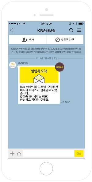또한, 보험료결제/계약변경/보험가입정보 안내 등 정보성 메시지에 한해서만 발송되고, 마케팅 목적으로 사용하지 않기 때문에 고객은 필요한 정보만을 수신할 수 있다. 카카오톡 프로그램을 통해 과거 메시지 관리 및 확인도 손쉽게 할 수 있는 등 고객 편의도 증대될 것으로 기대하고 있다.KB손해보험 고객지원본부장 홍성준 상무는 “커뮤니케이션 채널의 중심이라 할 수 있는 ‘카카오톡’을 통해 고객분들께 보다 빠르게 안내를 드리고자 이번 서비스를 도입하게 되었다”라고 밝혔다.카카오톡으로 관련 메시지를 받아보고 싶지 않다면 채팅방 상단에 있는 ‘알림톡 차단’을 눌러 기존처럼 SMS 문자로 받아볼 수 있으며, 카카오톡 미설치 고객 역시 SMS 문자로 안내 메시지가 발송될 예정이다.