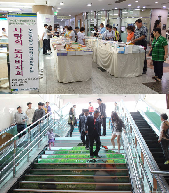 순천향대 부천병원과 부천시는 시민들의 걷기운동 생활화와 새로운 기부문화 조성을 위해 ‘걸으면서 기부하는 건강 계단’을 지하철 7호선 신중동역 3번 출구에 설치하였다. 시각적·청각적 재미요소가 가미된 계단으로 시민 한 명이 이용할 때마다 10원씩 기부금을 적립, 지역 저소득층 주민들의 응급 의료비로 사용된다.