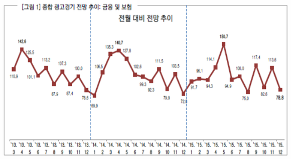 한국방송광고진흥공사(코바코, 사장 곽성문)는 금융업종의 12월 '광고경기 예측지수'(KAI)가 78.8로 지난달보다 광고비가 감소할 것으로 전망된다고 1일 밝혔다.