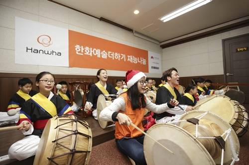 7일 저녁, 영등포에 위치한 좋은나무 지역아동센터 강당에서 지역 어린이와 한화 직원으로 이뤄진 사물놀이패의 신명 나는 국악과 탈춤 한마당이 펼쳐졌다. 함께한 동네 어르신들은 흥겨운 장단과 민요가락에 맞춰 자리에서 일어나 어깨춤을 추며 즐거운 시간을 보냈다.이날 행사는 한화그룹과 한국메세나협회가 주관하는 '한화예술더하기'프로그램의 일환으로, 전통문화 체험 기회가 적은 청소년/어린이들에게 우리 문화를 배우고 익힐 수 있는 기회를 제공해주기 위해 마련됐다.한화예술더하기는 지난 4월부터 전국 20개 지역에서 전통문화예술 교육 지원 프로그램으로 진행됐다. 초등학생과 한화그룹 직원들이 함께 참여해 매주 한 번씩 전문강사들에게 가야금, 사물놀이 등 전통악기 연주나 서예, 민화 등 전통예술을 배워 왔다.이날 영등포지역아동센터에서 공연한 초등학생들도 지난 8개월간 전문 사물놀이패 단원들로부터 꽹과리, 북, 장구 등을 다루는 법을 익혔고, 어른과 함께 어울리는 예절도 같이 배웠다. 이 행사는 동네 어르신을 비롯한 지역주민 앞에서 그 동안 익혔던 실력과 재능을 마음껏 뽐내는 자리였다.이같은 행사는 한화예술더하기 재능나눔이라는 이름으로 12월 중순까지 전국 스무 곳에서 진행된다.영등포에서 사물놀이를 펼친 참가 어린이는 "처음엔 장구 박자를 맞추는 것도 어려웠고 시끄러웠는데 꽹과리, 북, 징과 친해지면서 재미 있고 신이 나 매주 이 시간을 기다렸다”며, “오늘 공연에서 할아버지,할머니들이 박수도 많이 쳐주시고 칭찬도 해주셔서 좋았다"고 소감을 말했다.11월 말, 서울 성북구 정릉복지관 아동들과 함께 사물놀이 공연 무대에 올랐던 한화호텔앤드리조트의 김현빈 사원은 "아이들과 재능나눔 발표회를 준비하면서 많은 얘기를 나눈 게 가장 좋았다"며,"이번 기회에 우리 전통문화를 함께 배울 수 있어 보람도 크다"고 말했다.한화예술더하기는 한화그룹과 한국메세나협회가 2009년부터 7년째 운영해오고 있는 문화예술교육 프로그램이다.한화그룹 임직원들이 기금의 50%를 기부하고, 나머지 50%를 회사에서 지원하고 있다.지난 6년간 전국 100여개 복지기관의 2000여 어린이들에게 미술, 연극, 음악, 무용 등을 가르치고 체험의 기회를 제공했다.한화예술더하기는 아동들이 창의적 인재로 성장할 수 있도록 지원하는 점, 임직원 참여도가 높은 점, 지역 예술인들에 대한 경제적 지원 및 안정적인 활동 기회를 제공한 점 등 사회에 끼친 긍정적인 파급 효과와 성과를 높이 평가 받아 2011년에 한국메세나대상을 수상했고, 2014년에는 행복나눔인상을 수상했다.올해 초부터 시작한 전통문화예술사업은 2017년까지 3년 동안 진행하며, 기존 저소득층이나 복지시설 아동을 주 대상으로 했던 것과 달리 일반 초등학생 어린이로 대상을 확대했다. 전국 60개 기관(매년 20개씩)의 1,200여명의 아동들을 대상으로 가야금, 사물놀이, 창극, 전통무용, 서예/민화 등에 대한 교육을 제공한다.