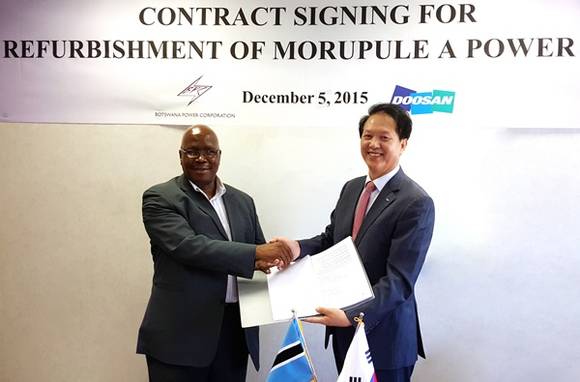 지난 5일 보츠와나 수도 가보로네에 위치한 보츠와나 전력청 본사에서 진행된 계약 체결식에는 보츠와나 전력청 제이콥 앤 랄릴루 CEO(최고경영자)와 두산중공업 김대수 터빈∙발전기BG 서비스영업 담당 등이 참석했다.