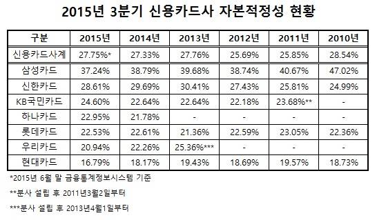16일 금융감독원 금융정보통계시스템에 따르면 신용카드업계의 조정자기자본비율은 6월 말 현재 기준 27.75%를 기록했다. 2010년 대비 0.79%포인트 낮아진 수치다. 이 수치가 낮으면 낮을 수록 건전성이 나쁘다는 것을 의미한다.