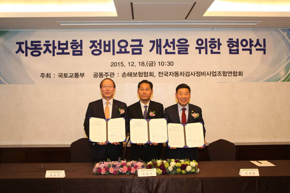 국토교통부와 손해보험협회, 검사정비연합회는 자동차보험 정비요금 개선을 위한 공동연구용역 협약을 18일 체결했다.