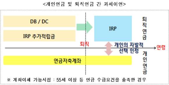 또한 55세 이상 등 연금 수급요건을 충족하게 되면 IRP(개인형 퇴직연금)에서 연금저축계좌로 이체가 가능하고 퇴직소득세 과세이연 등 기존 세제혜택도 유지된다.