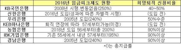 2005년부터 임금피크를 시행해 온 우리은행의 경우 매년 200~250명의 임금피크 대상자 중 절반 이상이 스스로 회사를 떠났으며 국민은행도 올해 상반기 임금피크 해당 직원을 포함해 희망퇴직으로 1122명이 나갔다.