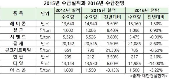 한편 올해 주요 자재 수급 상황을 살펴보면 주택시장 활성화 등의 호재로 아스콘을 제외한 레미콘, 철근 시멘트, 골재, 콘크리트 파일, 합판, 타일 등의 수요량이 모두 증가했다.