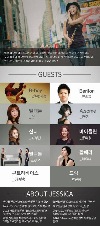 ‘설레임’이란 테마로 펼쳐질 이번 콘서트는 어렵고 딱딱한 클래식이 아니라 크로스오버 팝오보이스트 명성에 걸맞게 팝, 뉴에이지, 재즈, 일렉 까지 다양한 장르의 프로그램들을 선보이는게 특징이다. 제시카 리는 많은 오보에 연주자들 가운데 국내 유일한 팝오보이스트로 꼽힌다.