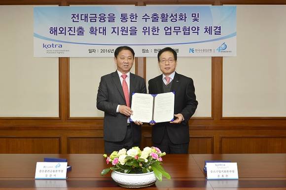 한국수출입은행은 대한무역투자진흥공사(코트라)와 손잡고 전대금융을 신흥시장으로 확대하기로 했다.20일 수출입은행은 코트라와 전대금융을 통한 수출 활성화 및 해외진출확대 지원을 위한 업무협약을 체결했다. 이번 업무협약에 따라 우리 기업들이 최근 수출 부진을 타개하고 신흥시장을 개척하는 데 큰 도움이 될 것으로 보인다.전대금융은 수출입은행이 외국 현지은행과 신용공여한도를 설정하고 현지은행은 수출입은행에서 보다 유리한 조건으로 자금을 조달해 한국기업과 거래관계가 있는 현지기업 및 한국 현지법인에 대출해주는 제도를 뜻한다.수출입은행과 코트라는 ▲주요 수입자 및 한국 현지법인을 대상으로 한 현지 공동마케팅 행사 ▲무역관을 활용한 전대금융 홍보 ▲주요 수입자, 한국 현지법인과 한국 현지법인의 현지 거래기업 등에 관한 상호 정보 공유 등을 주요 내용으로 한 업무협약서에 서명했다.수출입은행은 지난해말 기준 수출거점 15개국의 36개 은행과 통해 총 74억달러의 규모의 전대금융 신용공여 한도를 설정해두고 있다.코트라는 전세계 85개국에 125개 무역관을 두고 한국기업의 무역 및 투자와 관련한 원스톱 서비스를 제공한다. 또 현지 수입자에 한국의 수출기업을 알리는 역할도 한다.특히 수출입은행은 코트라가 추천하는 수입자에 대해서 우대금리를 제공할 방침이다.문준식 수출입은행 본부장은 이날 서명식 자리에서 "수은과 코트라가 공동 협력하에 현지 마케팅을 더욱 확대해 우리 기업의 신흥시장 진출을 위한 프론티어 역할을 더욱 강화해 나갈 것"이라 말했다.