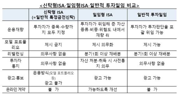 이에 따라 금융위원회는 투자자가 금융사에게 ISA 운영을 맡기는 '일임형 ISA'의 경우 투자자에게 적합한 2개 이상의 모델 포트폴리오를 제시하도록 의무화했다.