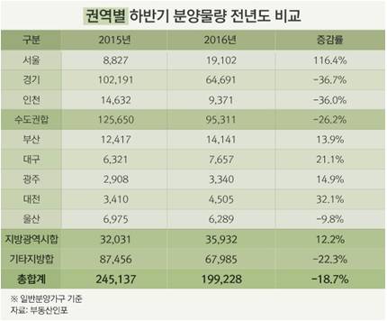 9일 부동산시장 분석업체 부동산인포에 따르면 수도권은 9만5311가구, 광역시 등 지방은 10만3917가구가 하반기에 공급된다. 하반기 물량은 지난해 동기보다 18.7% 줄었지만 올 상반기와 비교해 25.7% 증가했다.