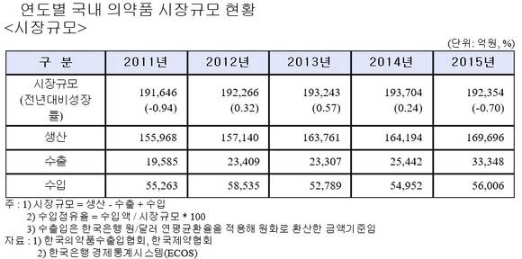 식약처에 따르면 2015년 의약품 생산실적은 16조9696억원으로 전년 대비 3.4% 증가했다. 의약품 수출은 29억5000만 달러(한화 약 3조3348억원)로 전년 대비 22% 크게 증가한 반면 수입은 49억4974만달러(5조 6006억원)로 전년 대비 5.1% 줄어 무역적자도 20억248만 달러(2조2658억원)로 29% 감소했다.