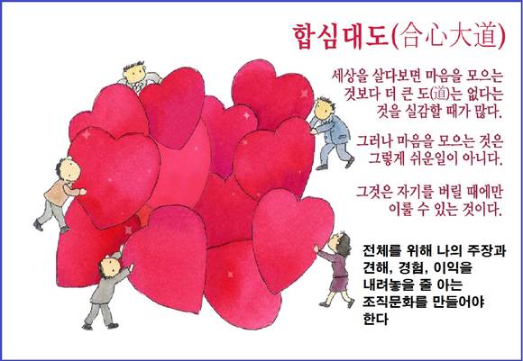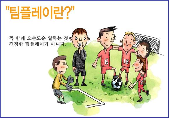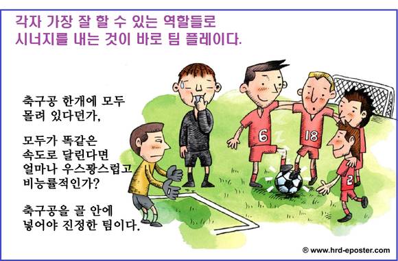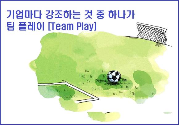 기업마다 시너지를 내기 위해서는 팀플레이(Team Play)가 잘 돼야 한다고 강조하고 있다.그러나 형식적으로 합심하는 것은 쉽지만, 마음을 모으는 것은 그리 쉽지 않다. 각자가 전체를 위해 나의 경험, 생각, 고집을 내려놓아야 한다.특히 팀플레이라는 것은 그저 한쪽 방향으로 뛴다고 되는 게 아니다. 효율적인 축구게임처럼 골키퍼, 수비수, 공격수 등 각자 롤에 최선을 다할 때 성공적인 팀플레이가 이뤄질 수 있다.